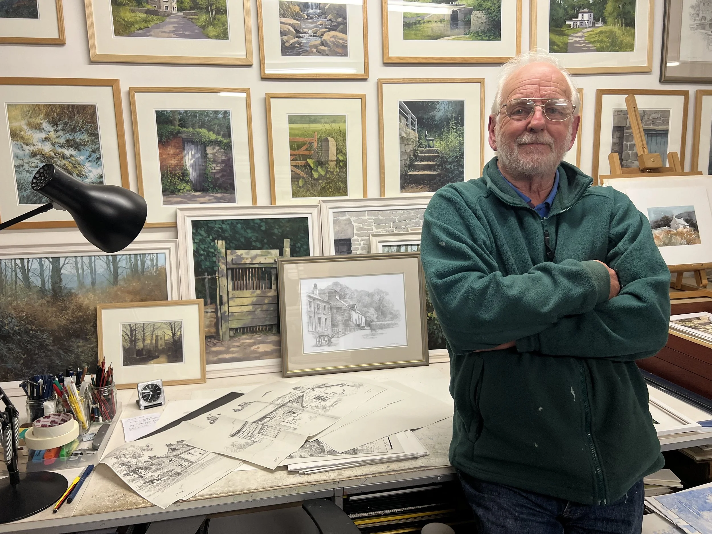 As you can see from these photos, he's drawn lots of local places, and places around the Peak District. These days he mainly paints rather than working in pencil. He's currently working on a painting of the open barn at Chadkirk.